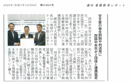 2025年10月6日の週刊 愛媛経済レポート、愛媛県四国中央市が一般社団法人全国古民家再生協会と 一般社団法人全国空き家アドバイザー協議会愛媛県四国中央支部の2団体の空き家に関する連携協定締結について掲載いただきました。...