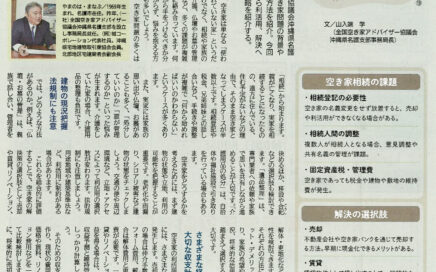 2025年10月3日の週刊タイムス住宅新聞に、一般社団法人全国空き家アドバイザー協議会沖縄県名護支部事務局長・山入端学さんが、空き家問題の現状把握から利活用解決の出口戦略について紹介されました。...