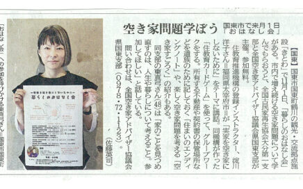 2025年10月27日の大分合同新聞に、一般社団法人全国空き家アドバイザー協議会大分県国東支部主催で11月1日に開催する「暮らしのおはなし会」について掲載いただきました。おはなし会では、市内で増える空き家問題について学ん...