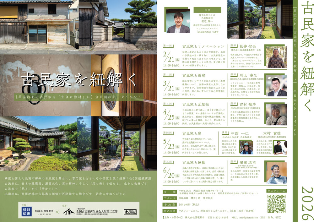 このたび、株式会社情報都市主催で、この古民家を「生きた教材」として古民家の魅力を多角的に学ぶトークイベント「古民家を紐解く」を全5回シリーズで開催いたします。