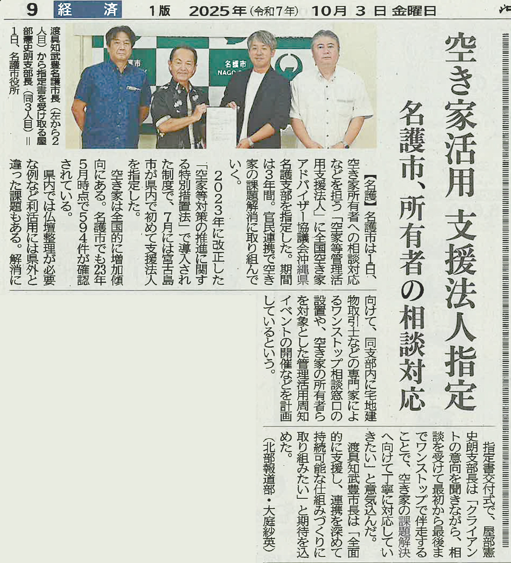 沖縄タイムスに掲載いただきました。 2025年10月3日沖縄タイムスに一般社団法人全国空き家アドバイザー協議会沖縄県名護支部が、沖縄県名護市から「空家等管理活動支援法人」に指定されたことが掲載されました。 メディア掲載カテゴリーの記事
