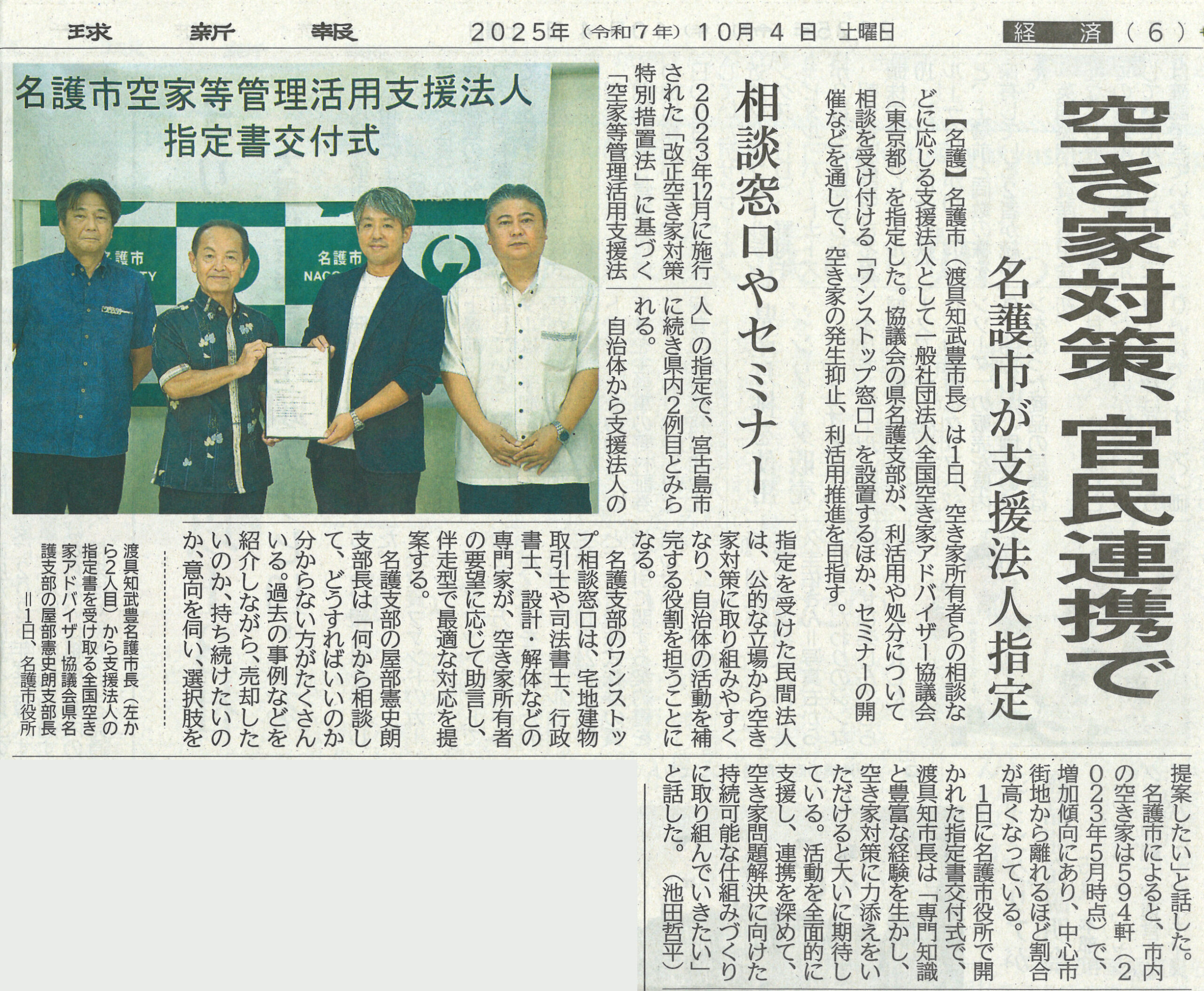 琉球新報社に掲載いただきました。 2025年10月4日の琉球新報社に、一般社団法人全国空き家アドバイザー協議会沖縄県名護支部が、沖縄県名護市より「空家等管理活動支援法人」に指定されたことについて掲載されました。 メディア掲載カテゴリーの記事