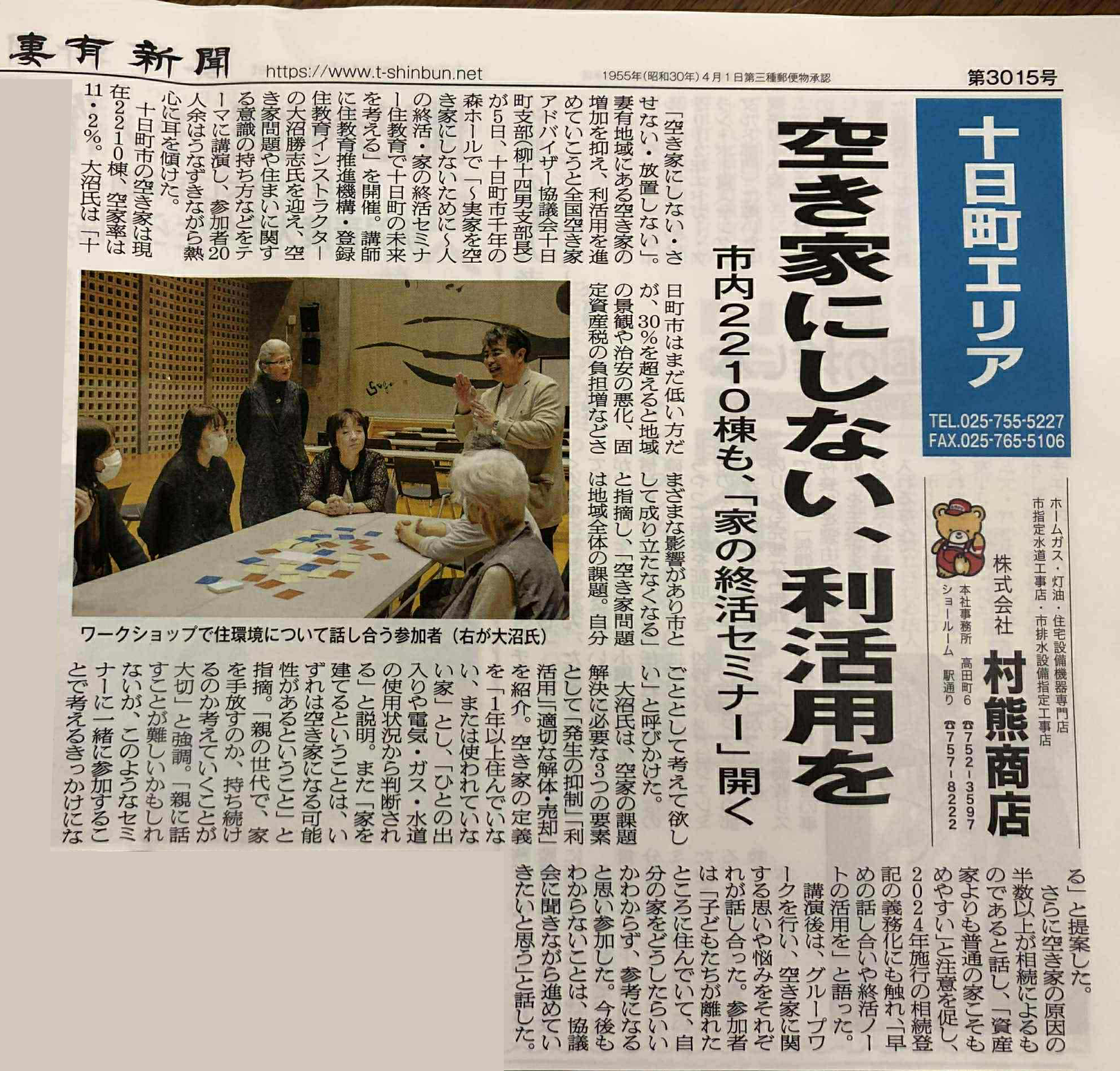 2025年10月18日の妻有新聞に、一般社団法人全国空き家アドバイザー協議会新潟県十日町支部が住教育インストラクター大沼氏を講師に迎え開催した空き家の利活用セミナについて掲載いただきました。