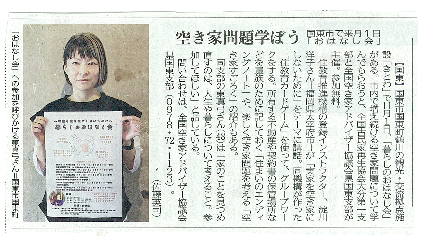 2025年10月27日の大分合同新聞に、一般社団法人全国空き家アドバイザー協議会大分県国東支部主催で11月1日に開催する「暮らしのおはなし会」について掲載いただきました。おはなし会では、市内で増える空き家問題について学んでいただけます。