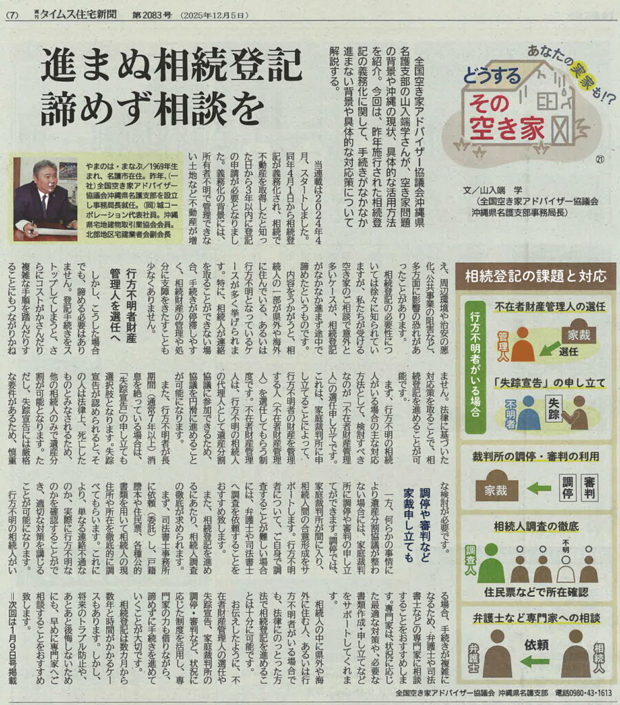 週刊タイムス住宅新聞に掲載いただきました。 2025年12月5日の週刊タイムス住宅新聞に、沖縄県名護支部の事務局長が解説する相続登記の義務化に関する記事を掲載いただきました。 メディア掲載カテゴリーの記事