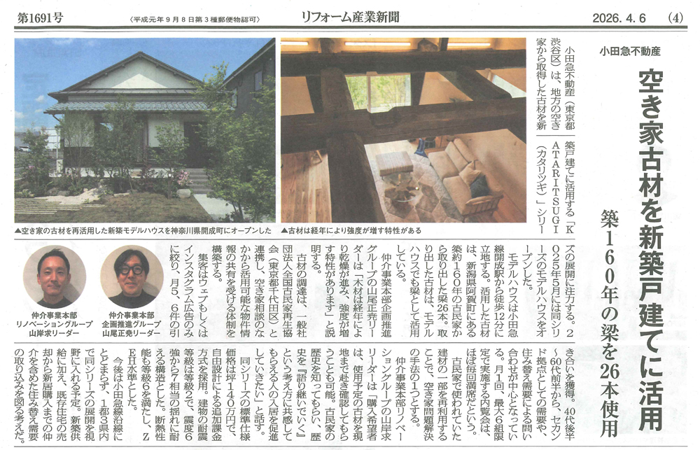 リフォーム産業新聞に掲載いただきました。 2026年4月6日のリフォーム産業新聞に、当法人が小田急不動産株式会社と連携しておこなう「KATARITSUGI(かたりつぎ)プロジェクト」について掲載いただきました。 メディア掲載カテゴリーの記事