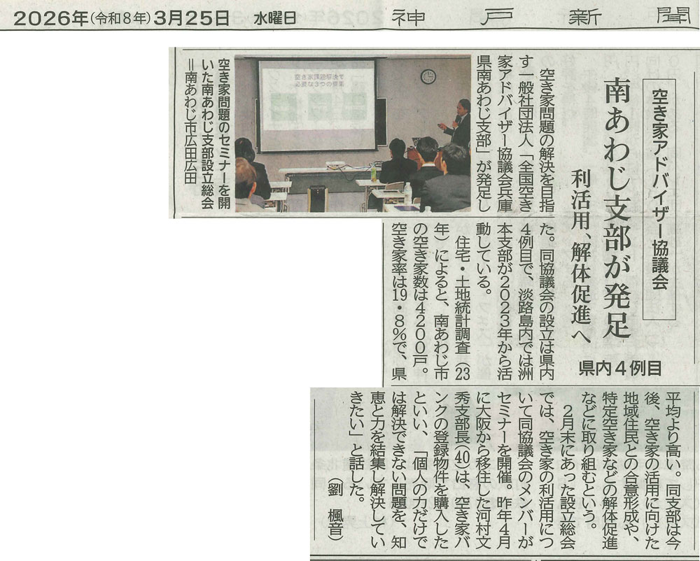 2026年3月25日の神戸新聞に、一般社団法人全国空き家アドバイザー協議会兵庫県南あわじ支部の設立について掲載いただきました。
