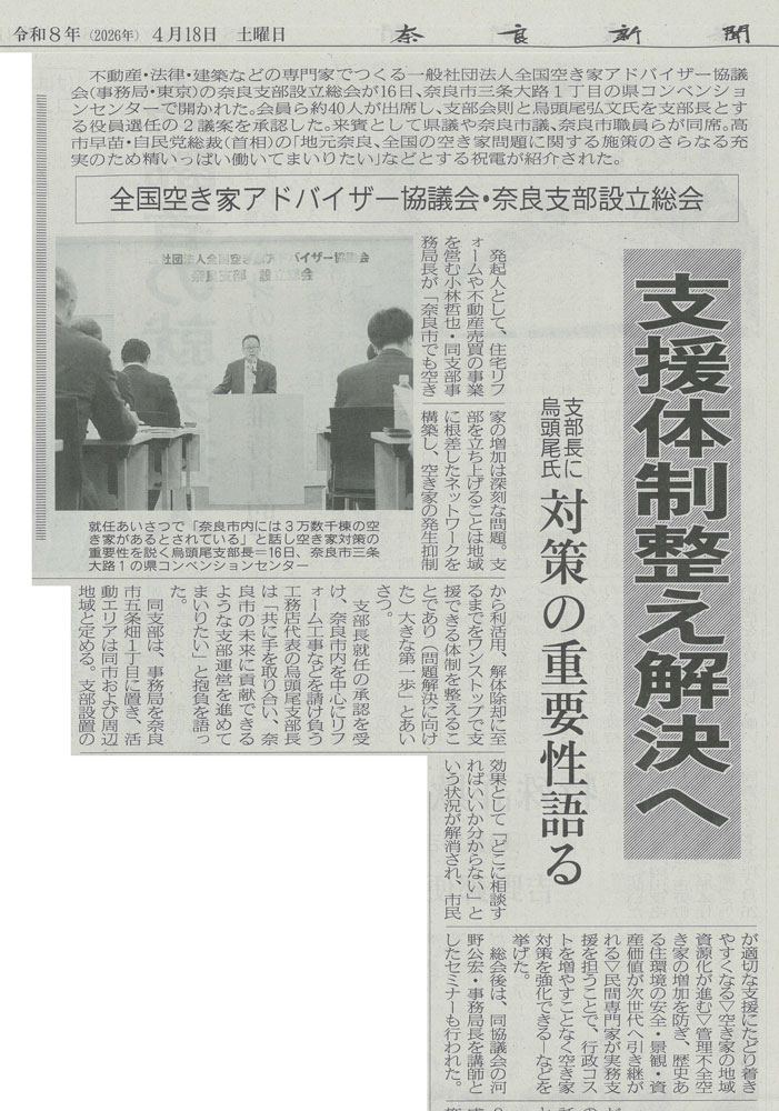 2026年4月18日の奈良新聞に、一般社団法人全国空き家アドバイザー協議会奈良支部の設立について掲載されました。