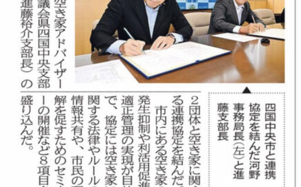 2025年9月22日の愛媛新聞に、愛媛県四国中央市が一般社団法人全国古民家再生協会と 一般社団法人全国空き家アドバイザー協議会愛媛県四国中央支部の2団体の空き家に関する連携協定締結について掲載いただきました。...