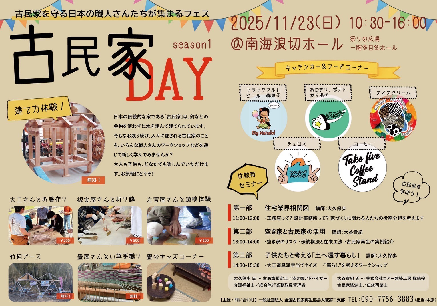 11月23日(日)10時30分~16時、南海浪切ホール(大阪府岸和田市港緑町1−1 MAP)にて「古民家DAY」イベントを開催します。