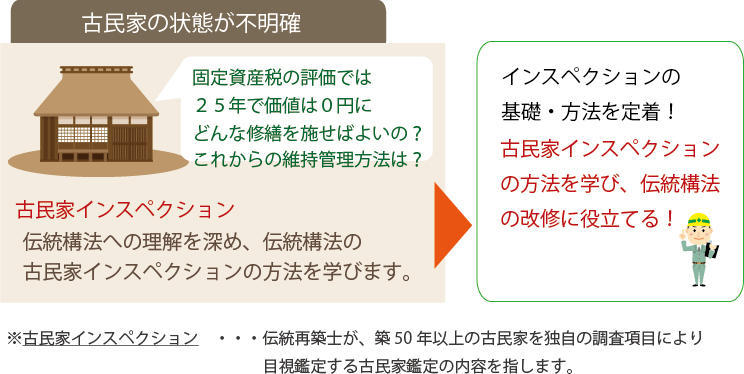 売買時のインスペクションの実施は建築士で既存住宅状況調査技術者資格を持つものが当たりますが、伝統構法においてその調査項目だけでは不十分な内容となってしまします。本資格は伝統構法に特化した調査内容を学び、伝統構法のインスペクション調査を実施するための資格です。